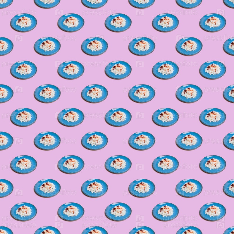 Бесшовный узор из синих тарелок с творогом на розовом фоне