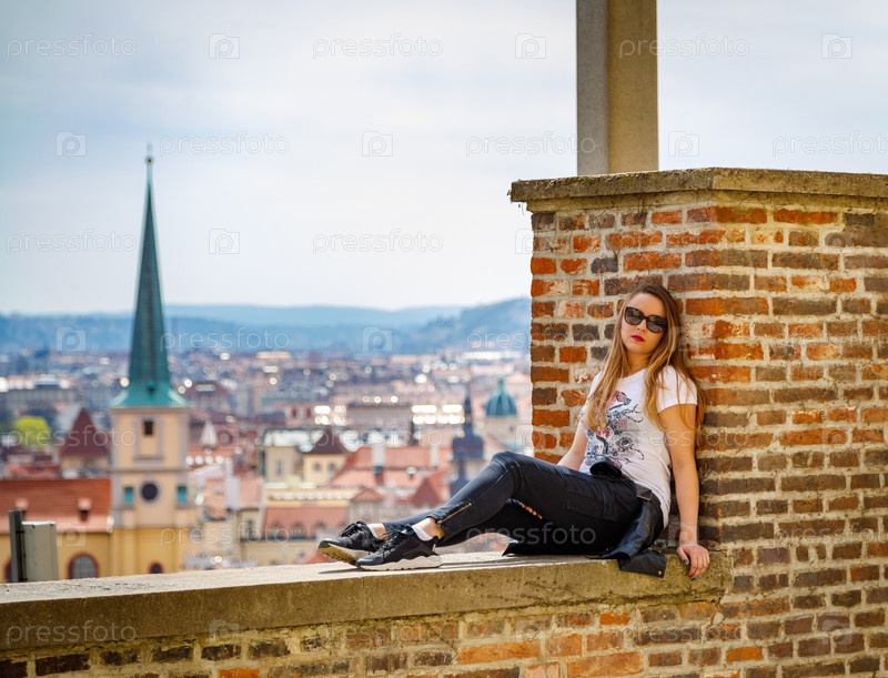 Девушка сидит на кирпичной стене и любуется панорамой Праги