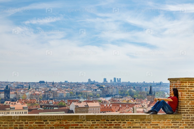 Мужчина сидит на кирпичной стене и любуется панорамой Праги