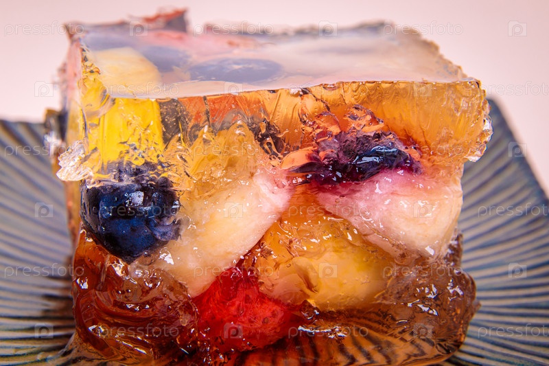 Желе из разных фруктов и ягод на квадратном блюдце. Десерт