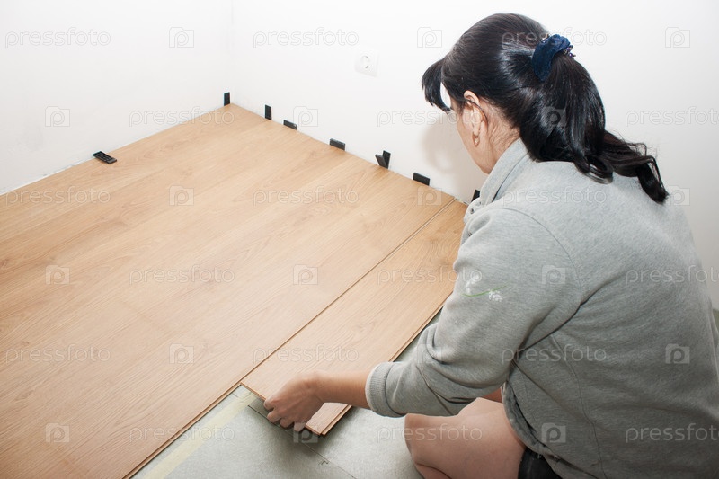 Молодая женщина укладывает ламинат