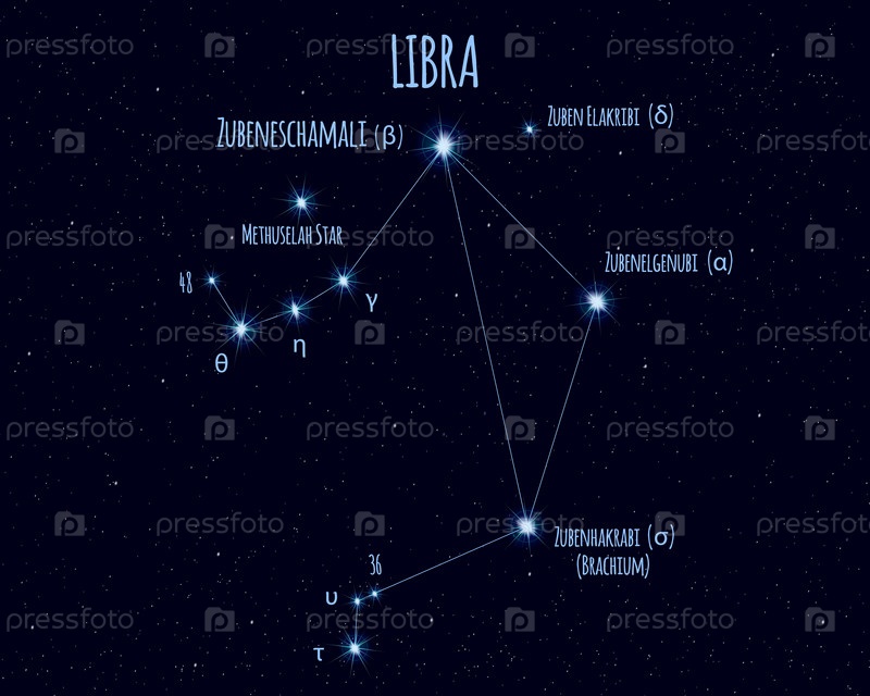 Созвездие Весов (Баланс), иллюстрация с названиями основных звезд на фоне звездного неба