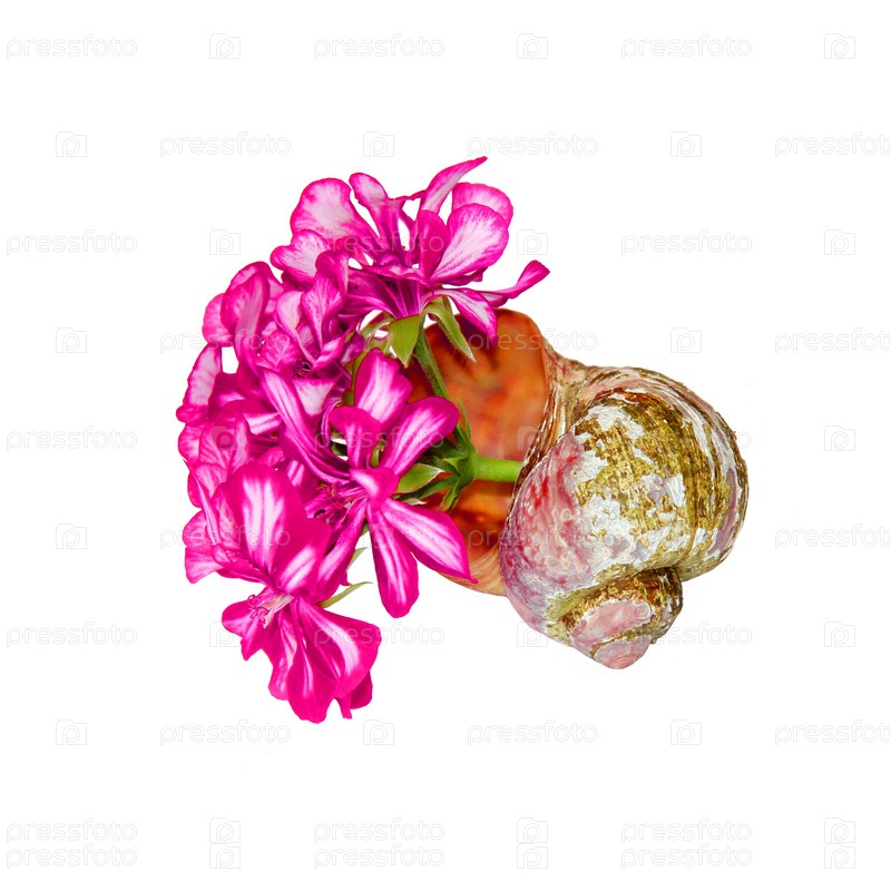 Букет цветов и листьев герани в старой потрепанной скорлупе, изолированной на белом фоне