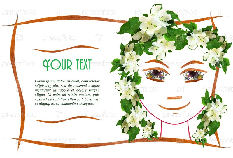 Приглашение с изображением контура лица девушки, аппликацией из цветов и листьев с местом для текста