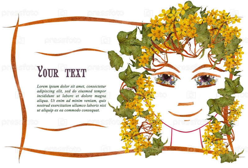 Приглашение с изображением контура лица девушки, аппликацией из цветов и листьев с местом для текста