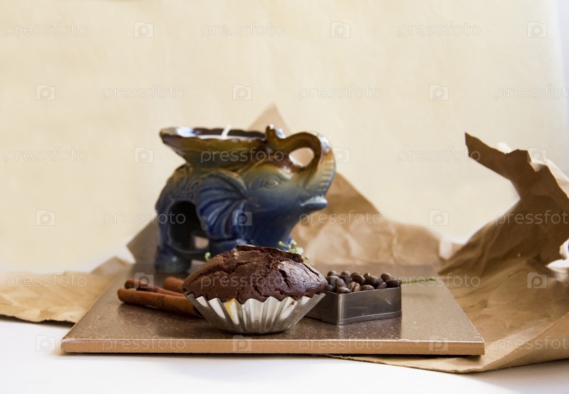 Белая свеча в подсвечнике, форма слона, ветка цветов, кофейные зерна в форме сердца, шоколадный кекс, палочки корицы, какао. композиция в коричневых и голубых тонах на скомканной оберточной бумаге