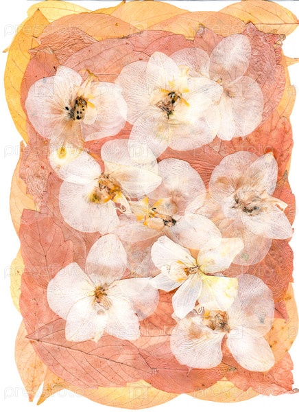 Белые сухие цветки орхидеи на отжатых кленовых листах