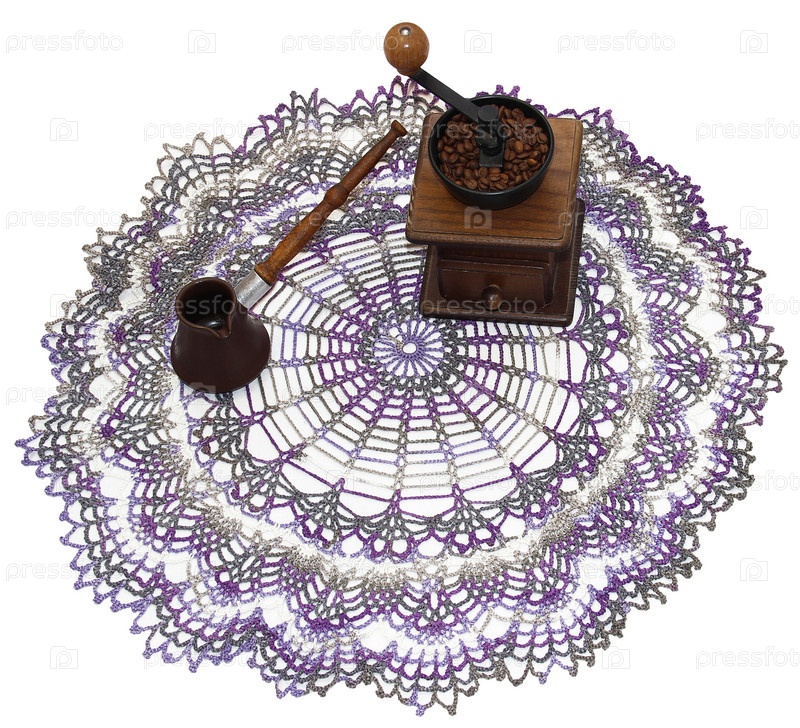 Винтажная вязаная салфетка с кофемолкой и джезвой