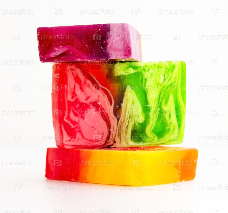Кусок яркого мыла ручной работы. Крупный план на белом фоне