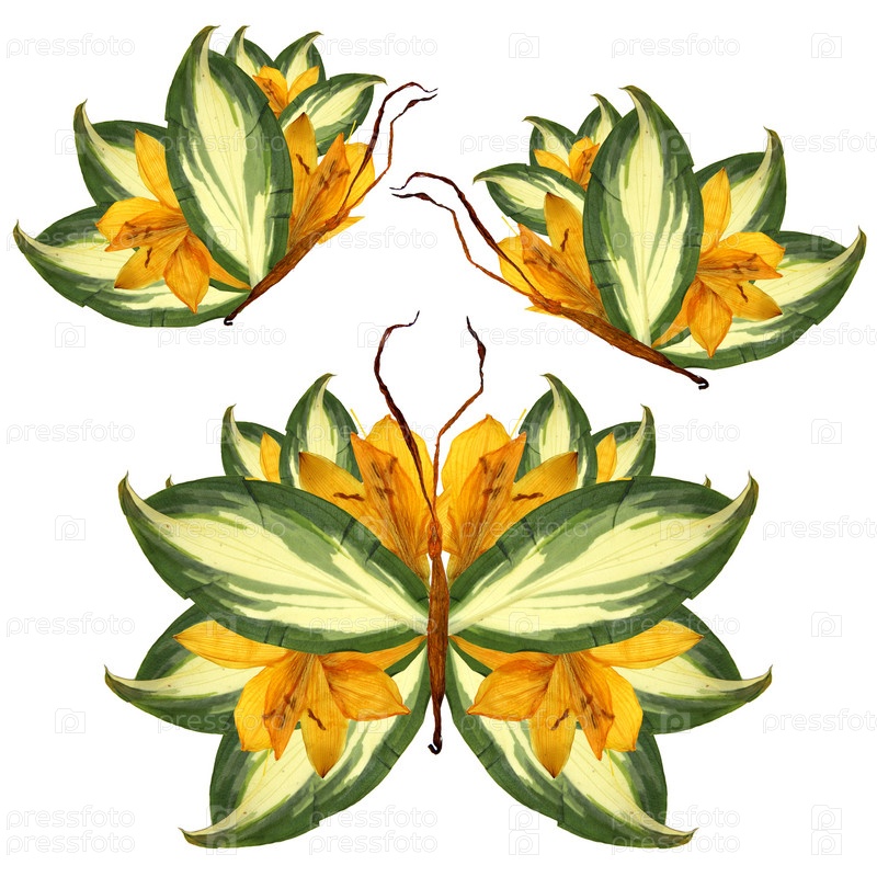 Цветочная бабочка из лепестков лилии, листьев и цветов