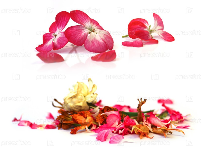 Герань, петуния, сухие нежные цветы, прессованные листья и лепестки, ирис, роза, бархатцы, пеларгония аквилегия, изолированные на белом фоне альбом