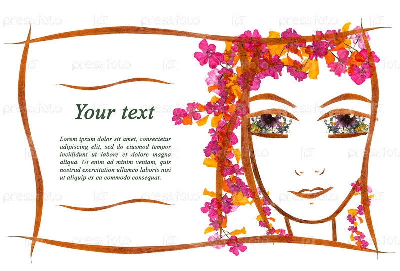 Пригласительная аппликация лица девушки из сухих цветов и листьев герани