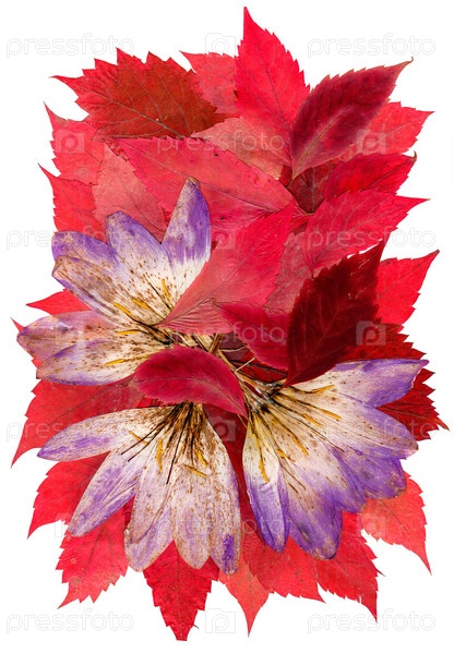 Сухой подснежник на прессованных красных кленовых листьях
