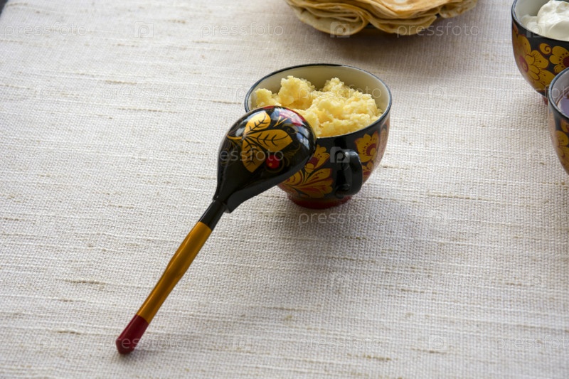 Завтрак из кукурузной каши в раскрашенной в старорусском стиле чашке, на накрытом льняной скатертью столе