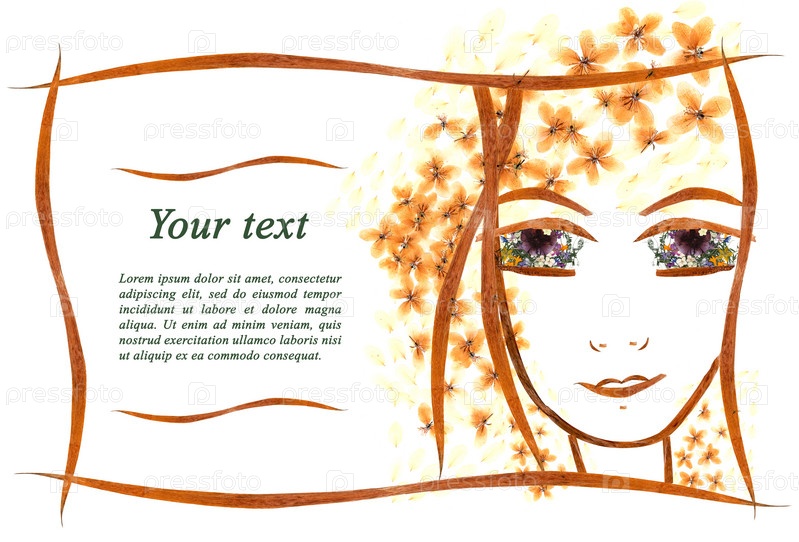 Пригласительная аппликация лица девушки из цветов и листьев яблони