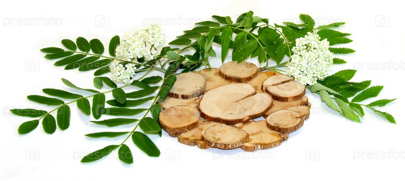 Белые цветы рябины и свежие листья, можжевельник стоит под горячей изолированной