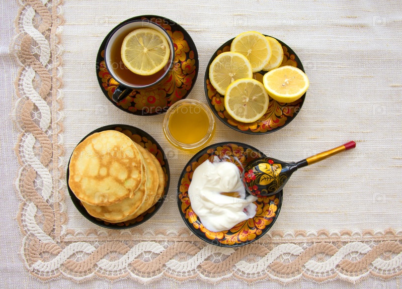 Чай в расписной чашке, на блюдце нарезанный лимон, блины, сметана и деревянная ложка для наложения. чаепитие в деревенском стиле