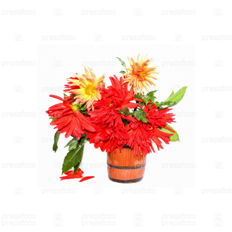 Красочные желтые, красные игольчатые цветы георгина с каплями воды в керамической кружке, разбросанные лепестки, изолированные на белом