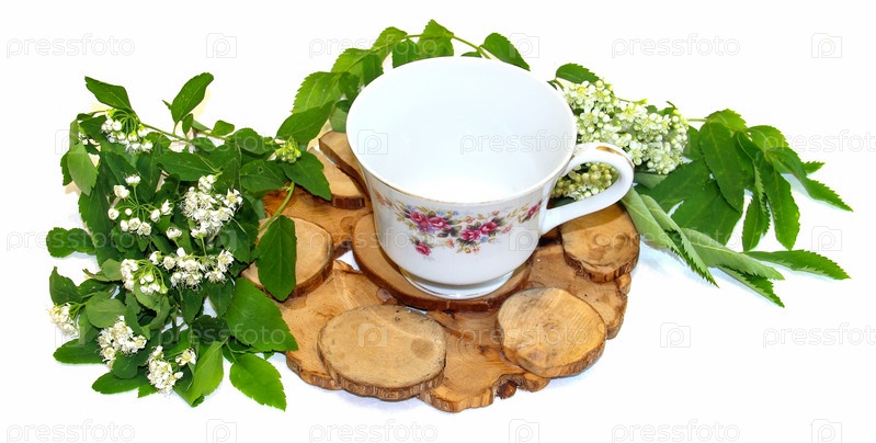 Белые цветы рябины и свежие листья, можжевельник стоят под горячей, фарфоровая пара чашка и блюдце изолированы