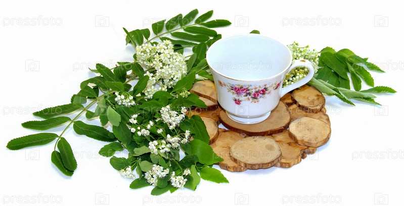 Белые цветы рябины и свежие листья, можжевельник стоят под горячей, фарфоровая пара чашка и блюдце изолированы