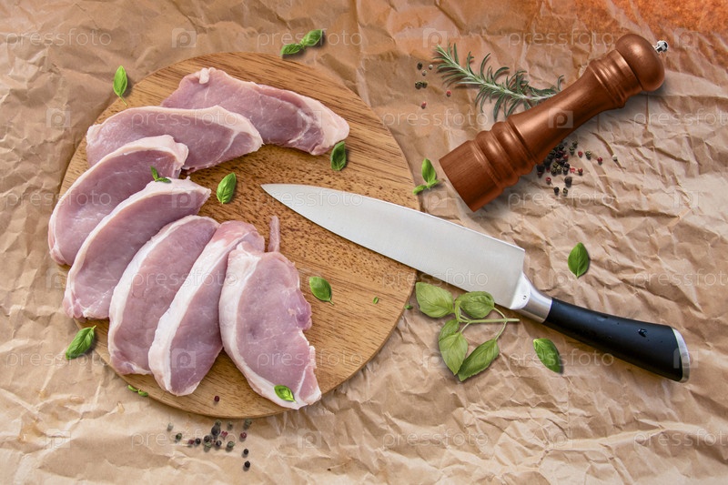 Свежие сырые свиные отбивные на разделочной доске. Расположение на оберточной бумаге