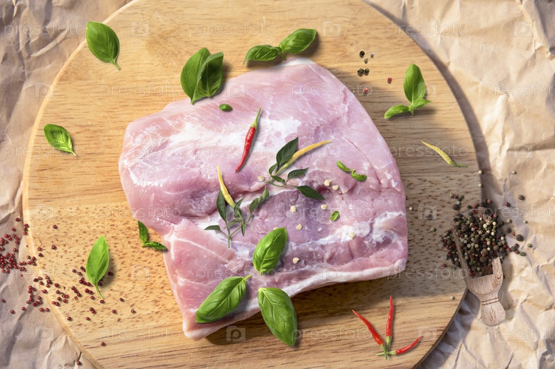 Свежие сырые свиные отбивные на разделочной доске. Расположение на оберточной бумаге