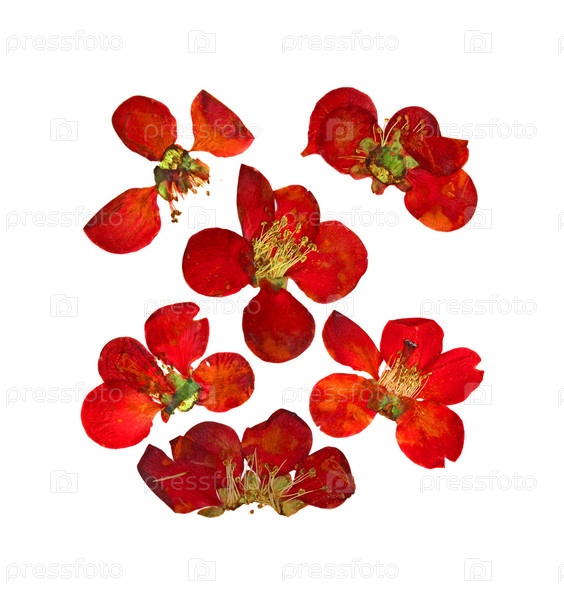 Прессованные и сушеные цветы и лепесток цветка айвы из больших красных цветов японики, хеномлеса, выделенные на белом фоне альбома для вырезок