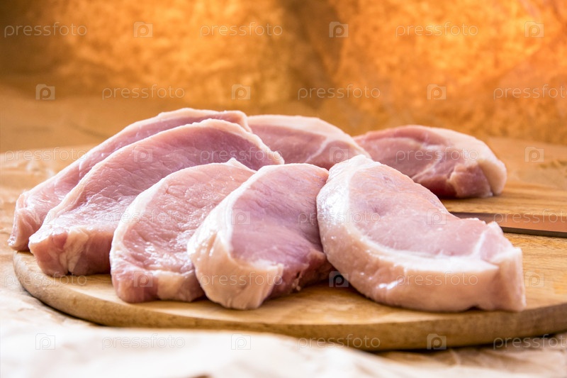 Свежие сырые свиные отбивные на разделочной доске. Расположение на оберточной бумаге