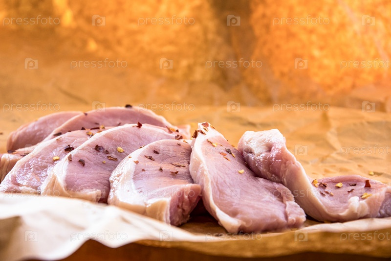 Свежие сырые свиные отбивные на разделочной доске. Расположение на оберточной бумаге