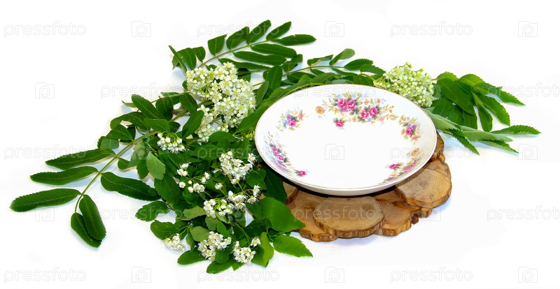 Белые цветы рябины и свежие листья, можжевельник стоят под горячей, фарфоровая пара чашка и блюдце изолированы