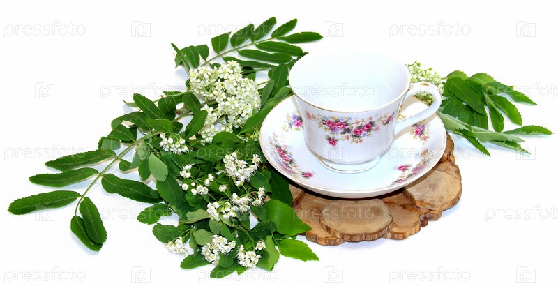 Белые цветы рябины и свежие листья, можжевельник стоят под горячей, фарфоровая пара чашка и блюдце изолированы