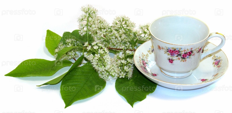 Можжевельник стоит под горячей фарфоровой парой чашки и блюдца, цветущая ветвь белой вишни изолирована