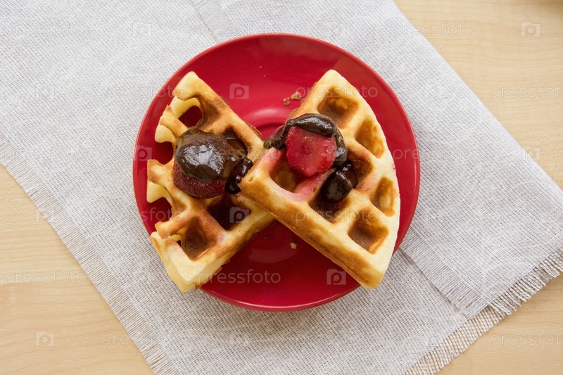 Венские вафли с клубникой и шоколадом на тарелке
