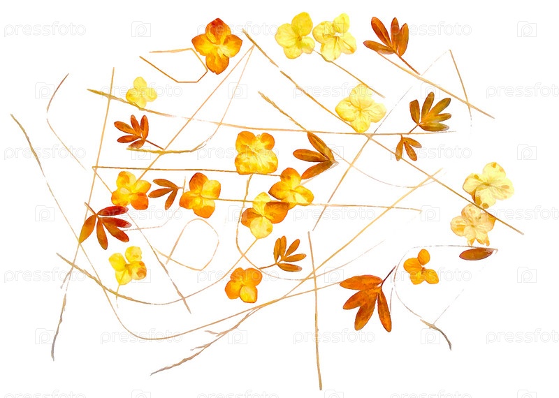 Рисунок сухих осенних листьев растений и ветвей изолированных элементов на фоне белой акварельной бумаги для альбома для вырезок, окрашенных деревянных досок, объекта, грубого осеннего листа