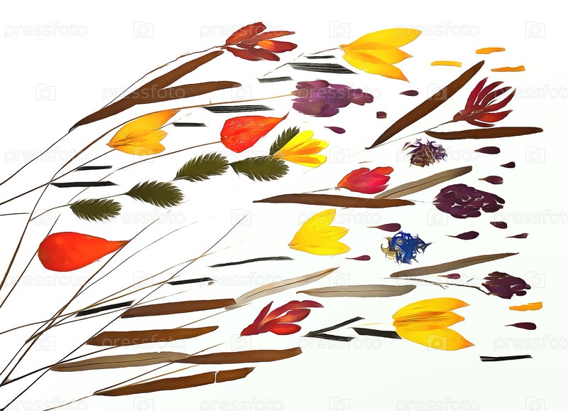 Рисунок сухих осенних листьев и цветов на решетке из тонкой соломы и веток, изолированных на белом фоне акварельной бумаги для альбома для вырезок, окрашенных деревянных досок, объекта, грубого осеннего листа