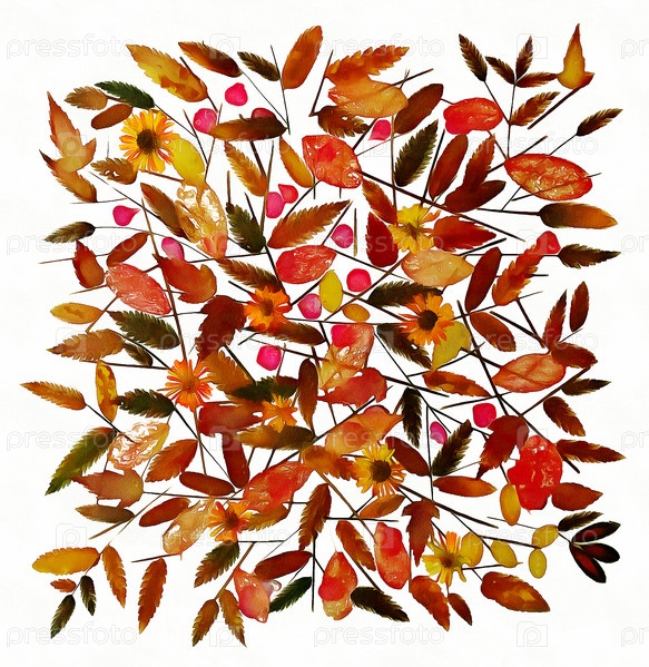 Рисунок сухих осенних листьев и цветов на решетке из тонкой соломы и веток, изолированных на белом фоне акварельной бумаги для альбома для вырезок, окрашенных деревянных досок, объекта, грубого осеннего листа