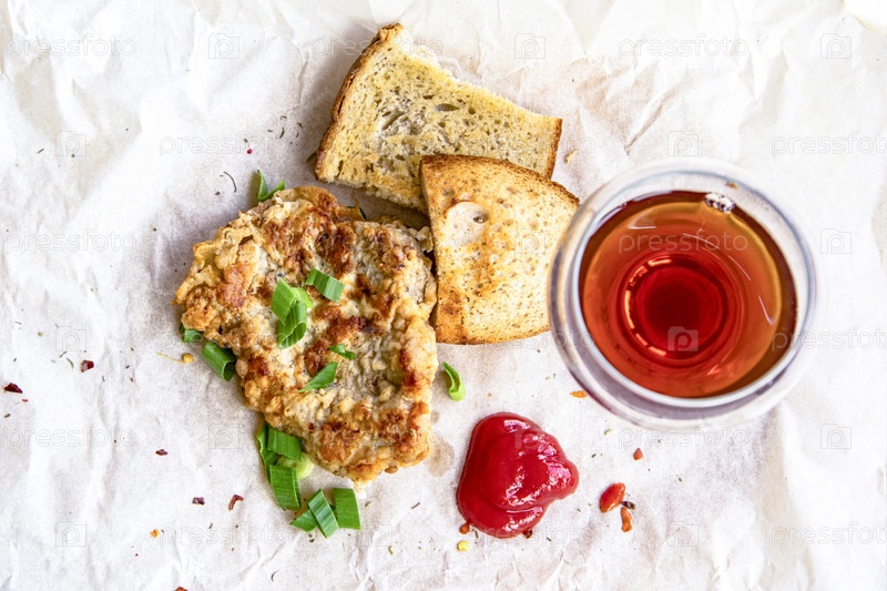 Свежие жареные свиные отбивные, посыпанные зеленым луком и кетчупом. Расположение на оберточной бумаге