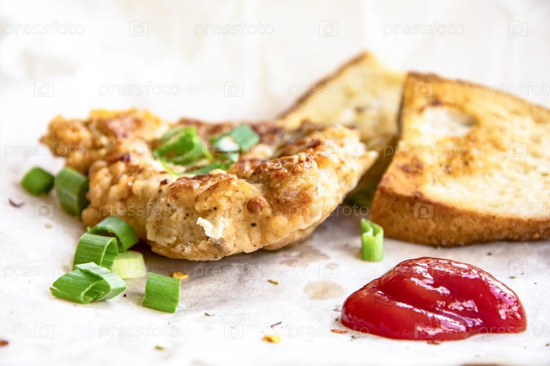 Свежие жареные свиные отбивные, посыпанные зеленым луком и кетчупом. Расположение на оберточной бумаге