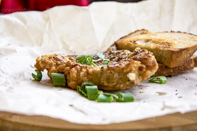 Свежие жареные свиные отбивные, посыпанные зеленым луком и кетчупом. Расположение на оберточной бумаге