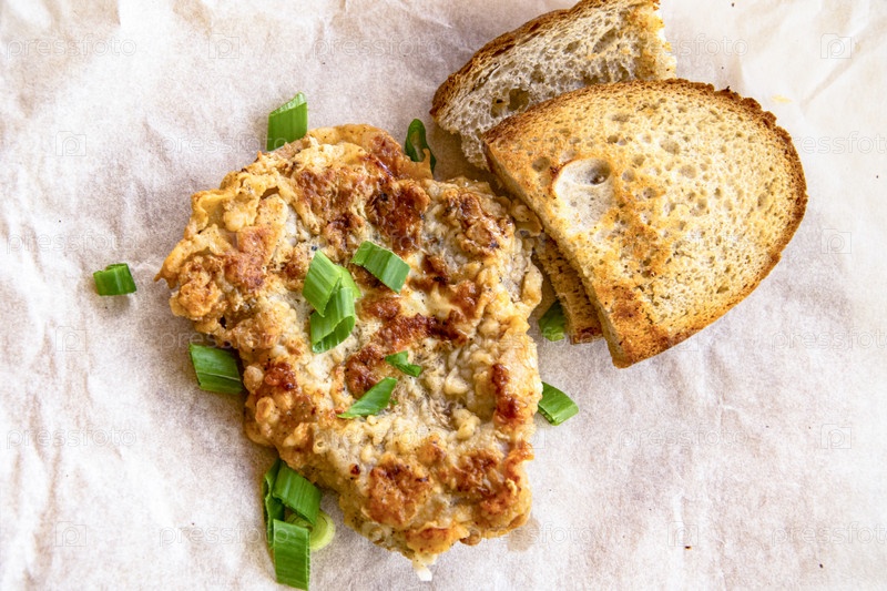 Свежие жареные свиные отбивные, посыпанные зеленым луком и кетчупом. Расположение на оберточной бумаге