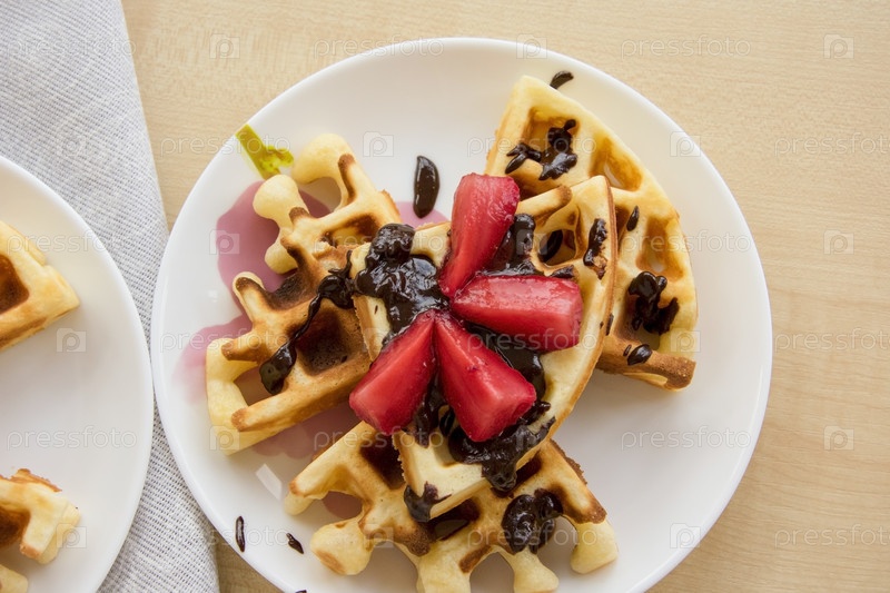 Венские вафли с клубникой и шоколадом на тарелке