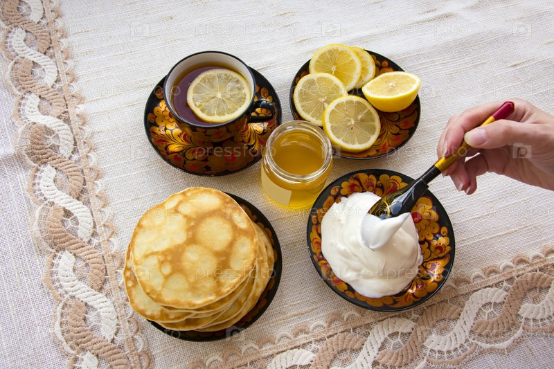 Чай в расписной чашке, на блюдце нарезанный лимон, блины, сметана и деревянная ложка для наложения. чаепитие в деревенском стиле
