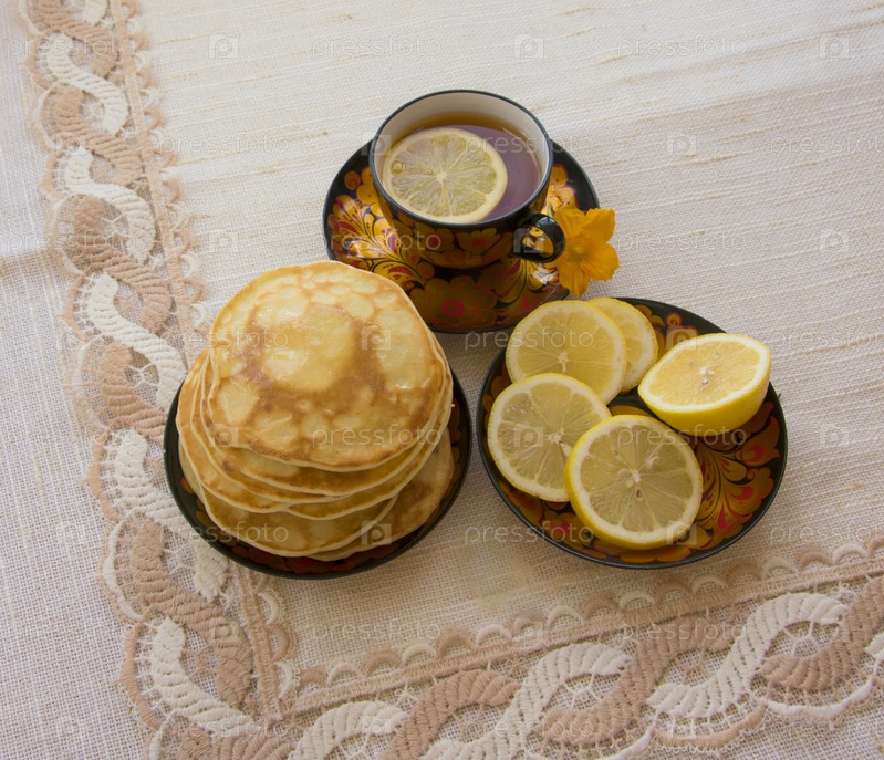 Чай в расписной чашке, на блюдце нарезанный лимон, блины, сметана и деревянная ложка для наложения. чаепитие в деревенском стиле