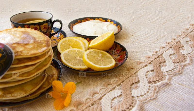 Чай в расписной чашке, на блюдце нарезанный лимон, блины, сметана и деревянная ложка для наложения. чаепитие в деревенском стиле