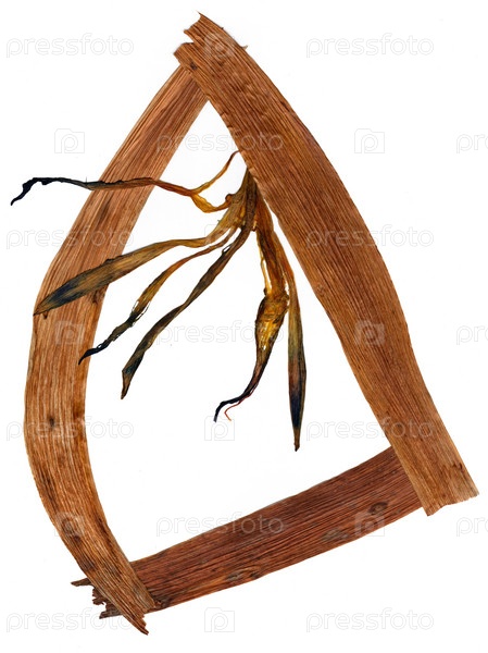 Сухие изогнутые цветы лилии под длинными прессованными жесткими коричневыми листьями ириса