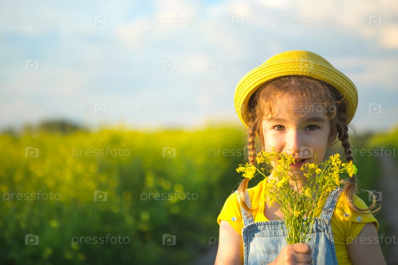 Девушка в желтом летнем поле нюхает букет цветов. Солнечный день, праздники, аллергия на цветение, свобода. Выращивание сельскохозяйственных культур рапса, гречихи. Копировать пространство