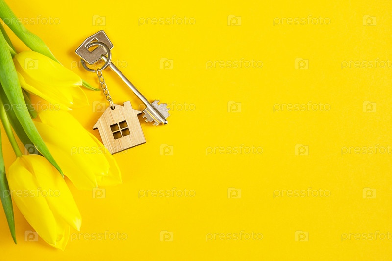 Брелок для ключей в форме деревянного дома с ключом на желтом фоне и весенними тюльпанами. Строительство, дизайн, проект, переезд в новый дом, ипотека, аренда и покупка недвижимости, летнее предложение. Копировать пространство