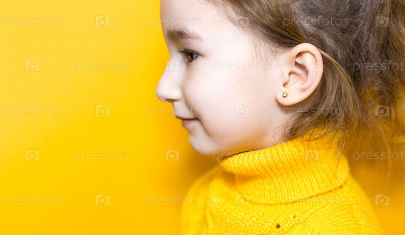 Прокалывание ушей у ребенка - девочка показывает сережку в ухе из медицинского сплава. Желтый фон, портрет девушки в профиль