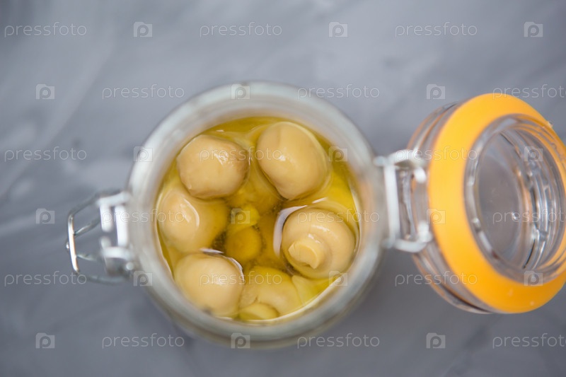Маринованные грибы в стеклянной банке. Закуска крупным планом в масле и рассоле
