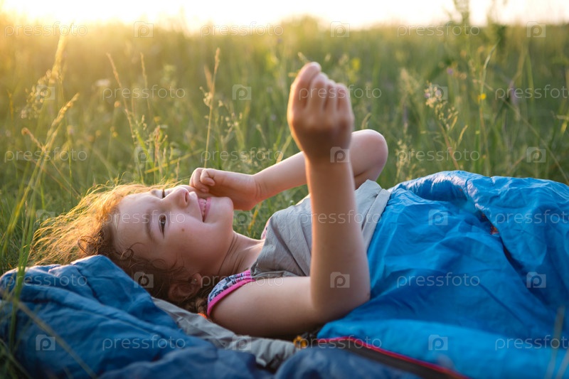 Девушка недовольна царапинами от укусов комаров, ребенок спит в спальном мешке на траве в походе. Экологичный отдых на природе, летнее время. Нарушение сна, отталкивающий